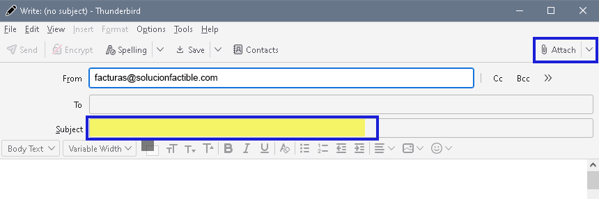 In the Attach option, select the XML and PDF files you generated for your client. Then, in the recipients field, enter the email address specified by your client; for this example, we'll use the general account for Solución Factible: facturas@solucionfactible.com.